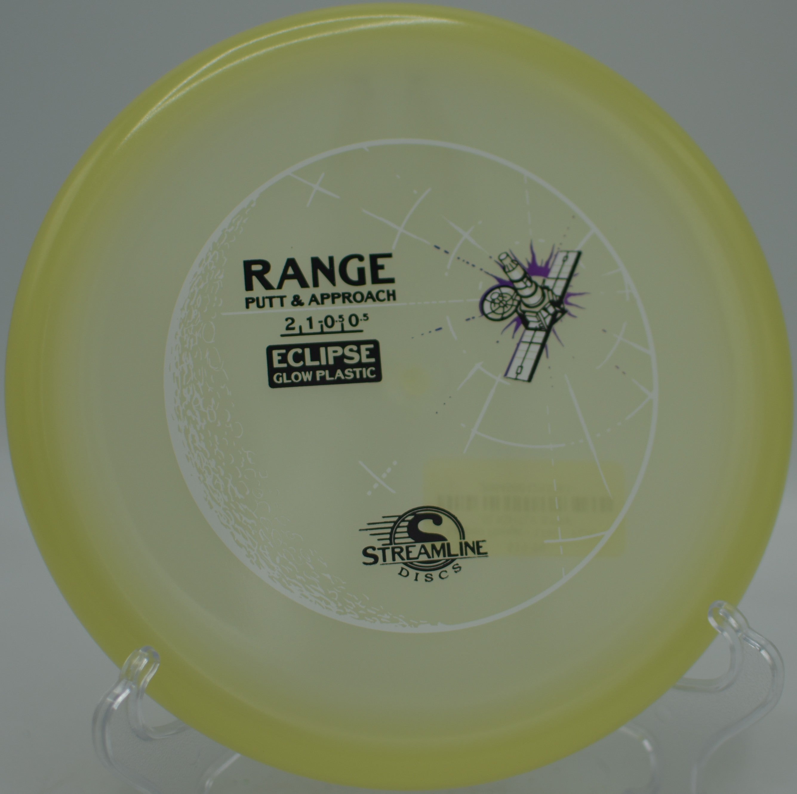 The Streamline Eclipse Glow Range is a low-speed, neutral putt and approach disc crafted for accuracy and consistency, now offered in Eclipse Glow plastic for night rounds and low-light play. With its shallow, beadless profile and smooth release, the Range is built to hold lines and land softly near the basket, excelling on both backhand touch shots and forehand flick approaches.