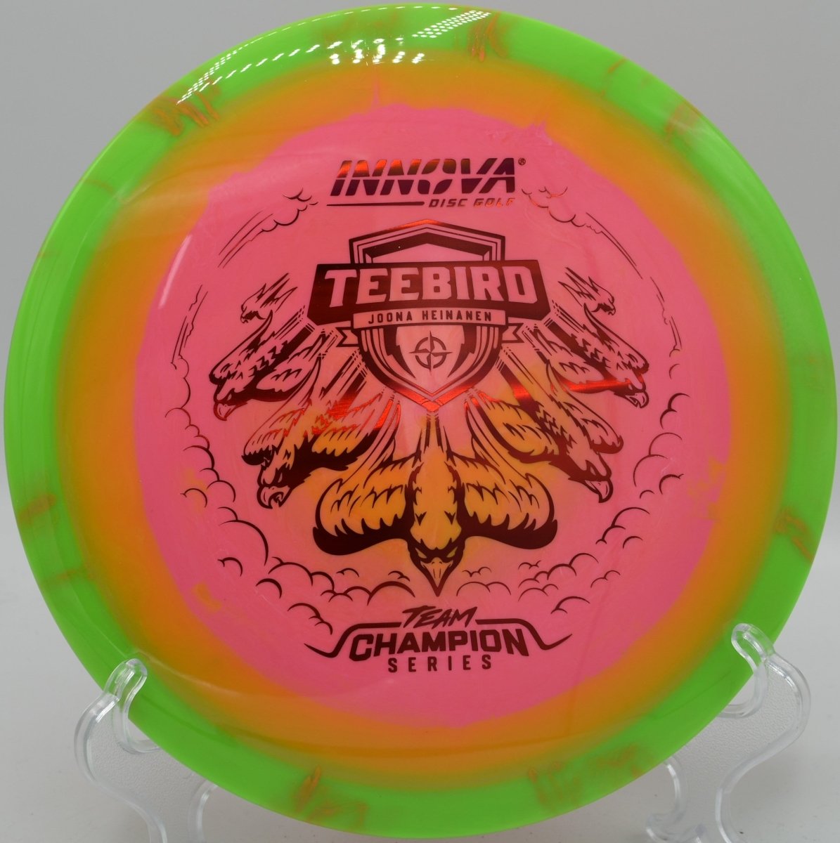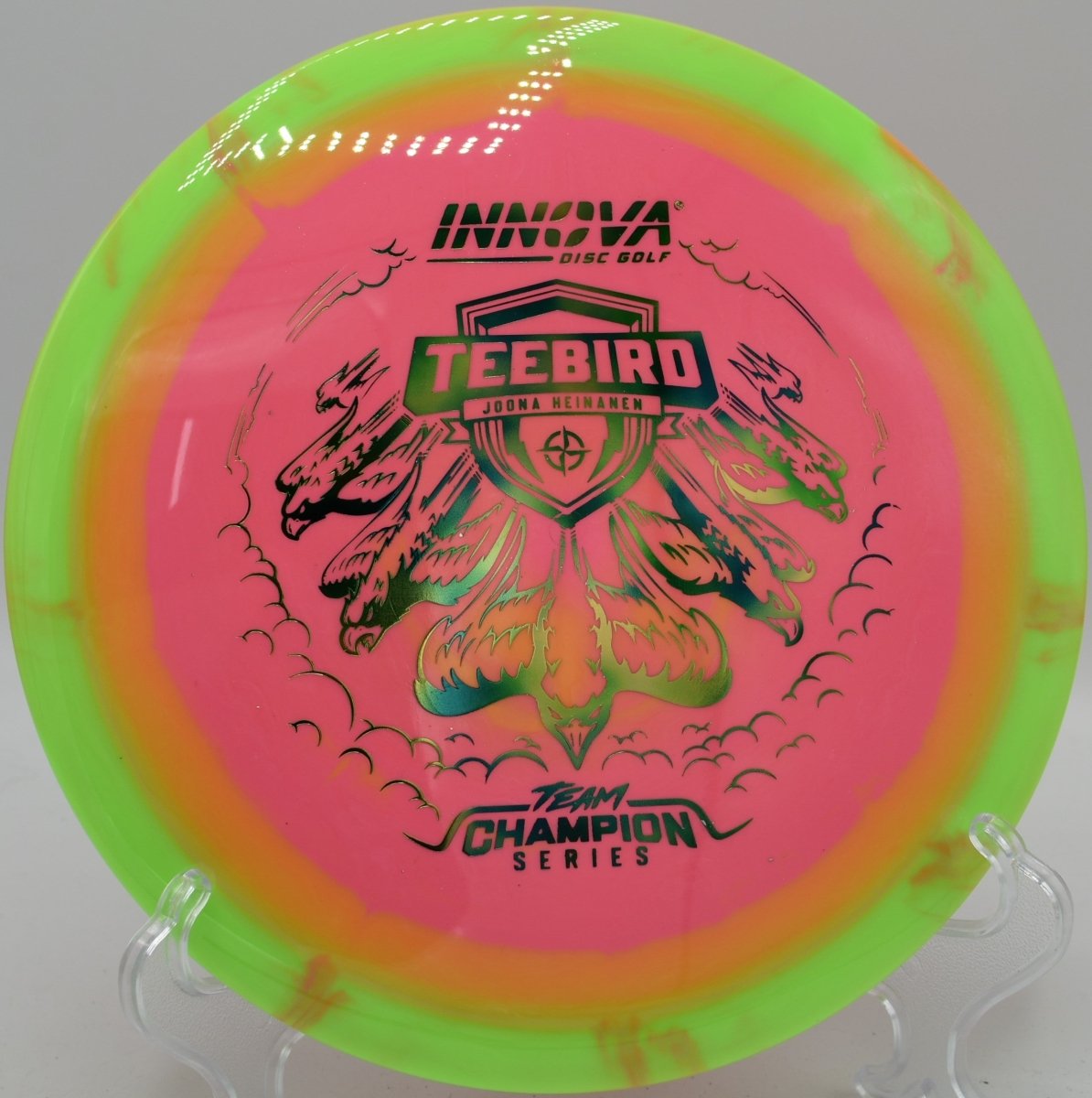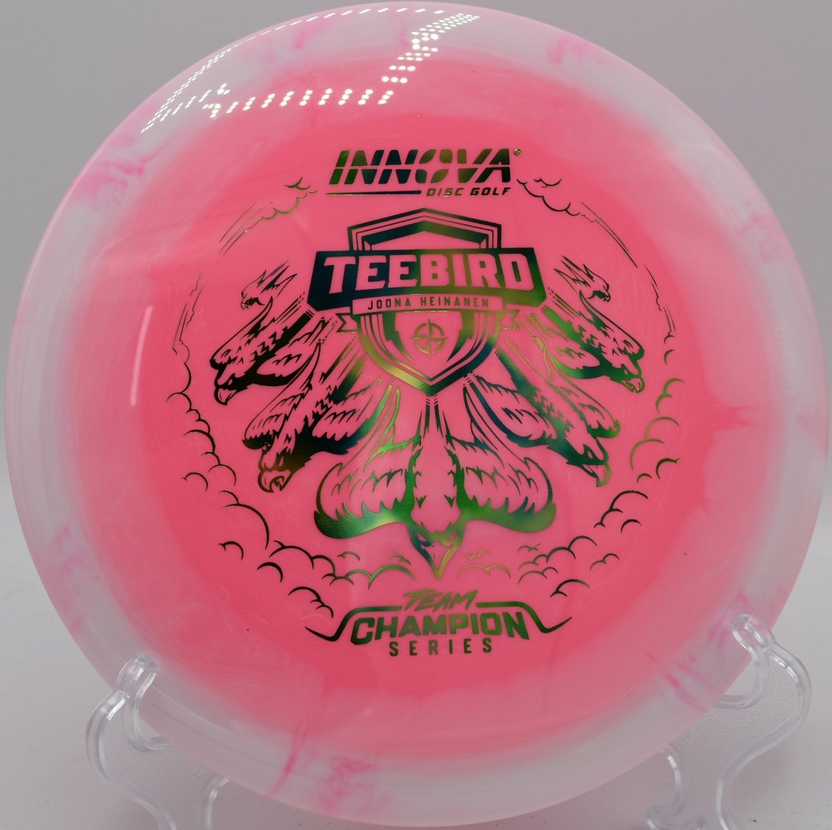 Molded in Halo Star plastic, this TeeBird features a grippy, premium feel with enhanced durability and a touch of added stability compared to standard Star runs. The Halo construction concentrates weight toward the rim, increasing torque resistance and consistency while also creating the signature two-tone visual effect that stands out in flight. Produced by Innova Disc Golf, the Halo Star TeeBird excels on straight drives, controlled hyzers, and placement shots where accuracy is critical.