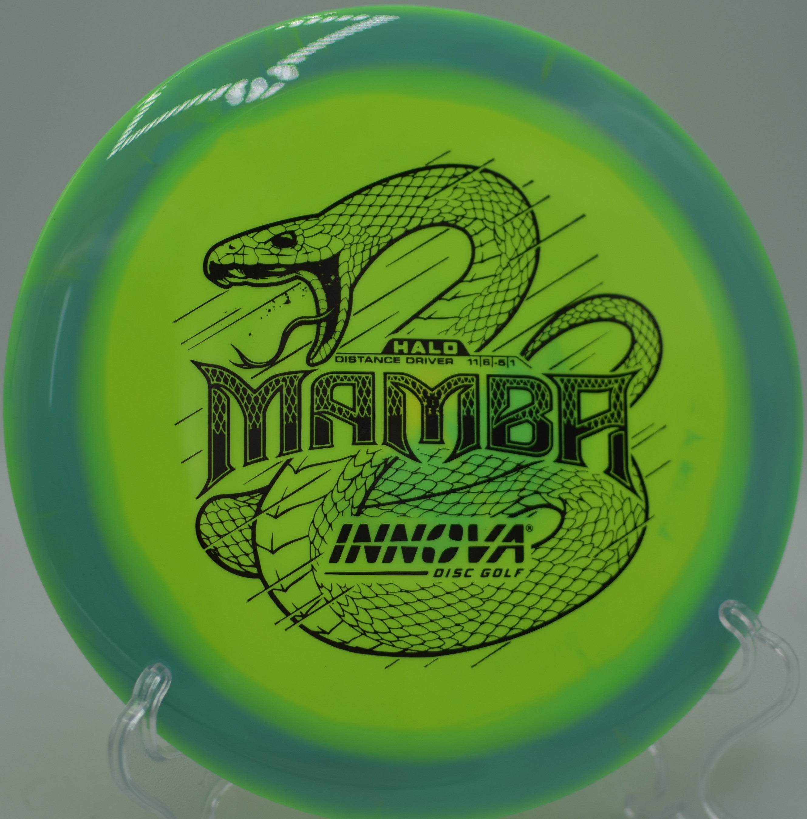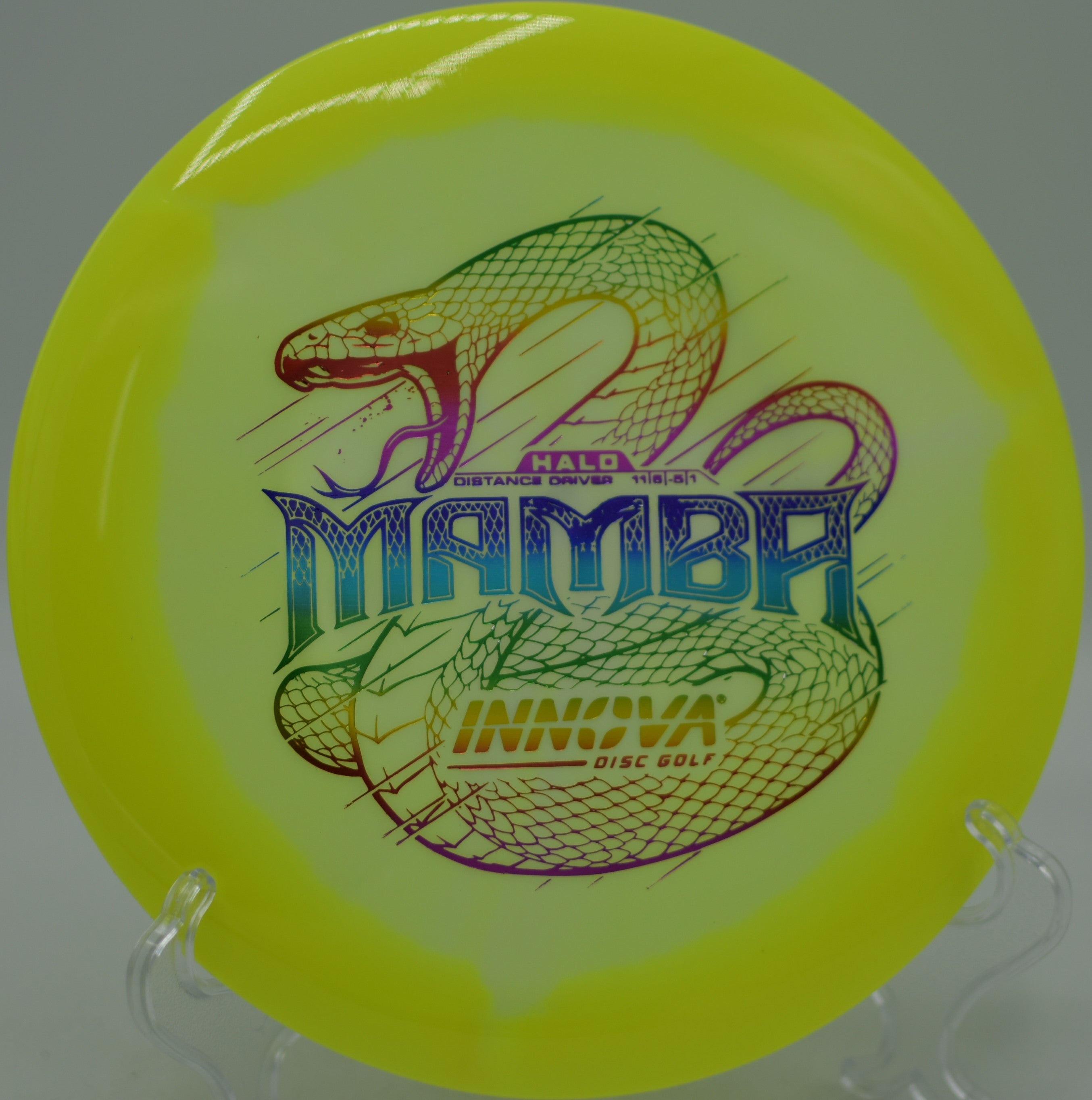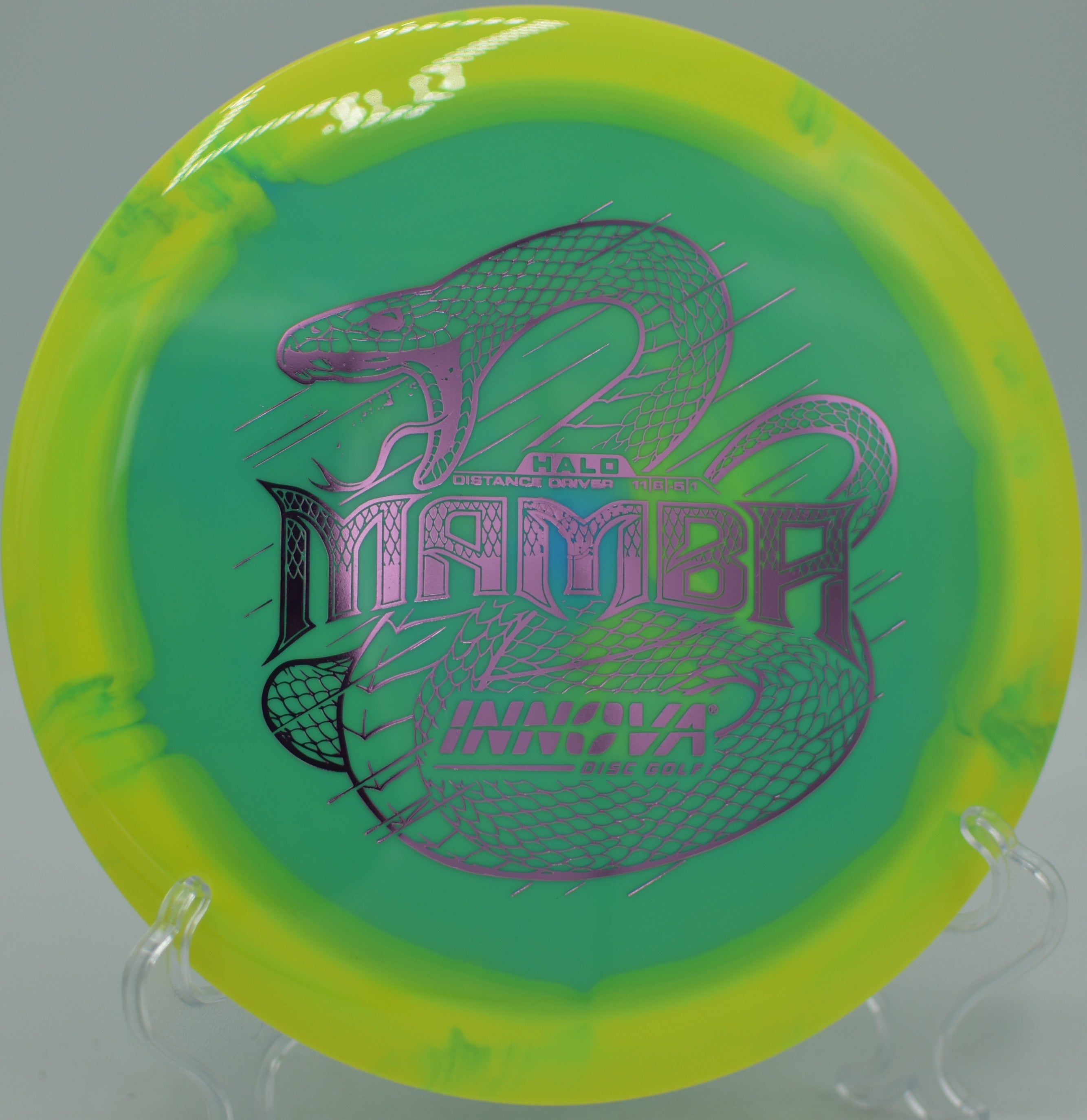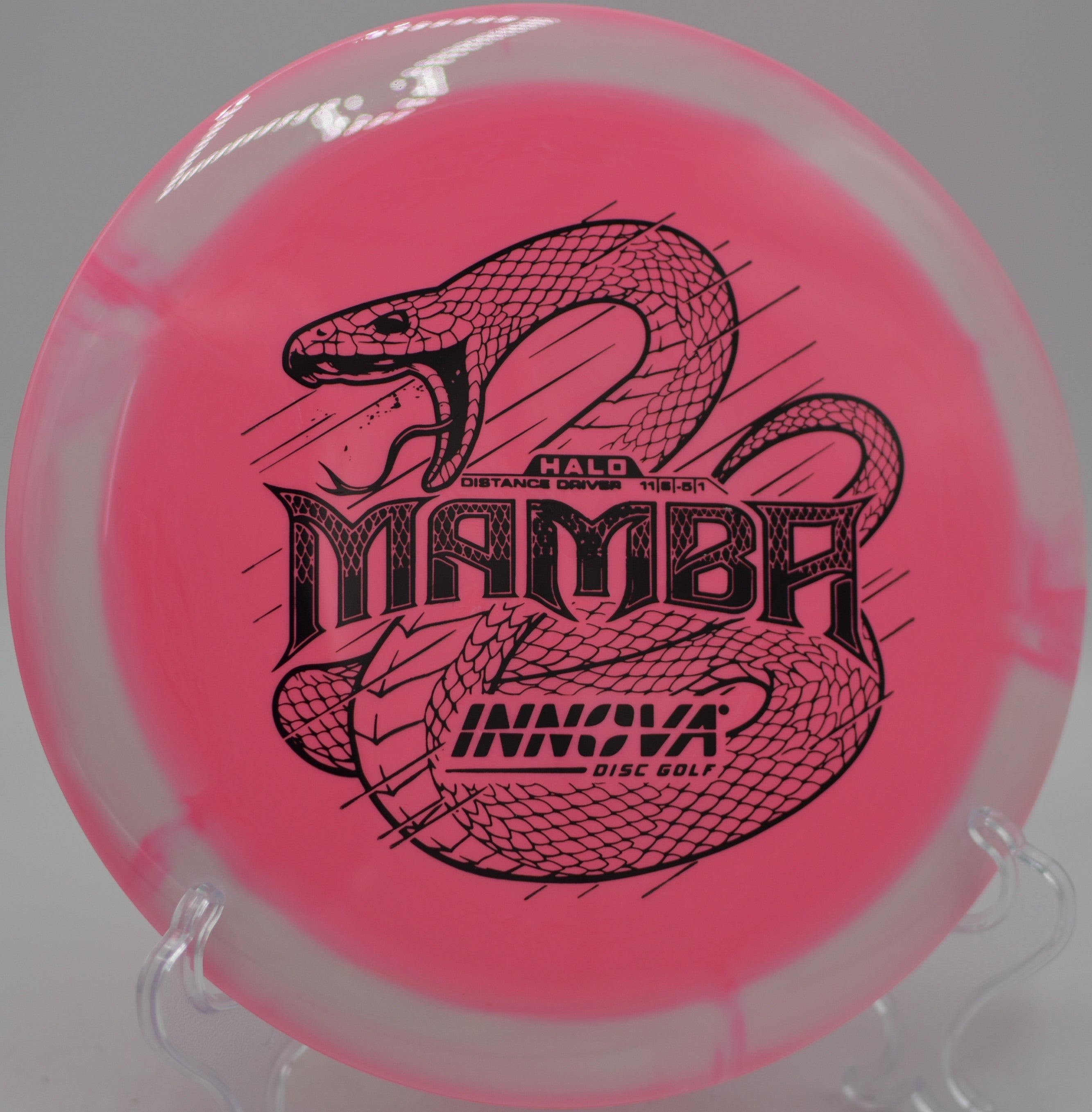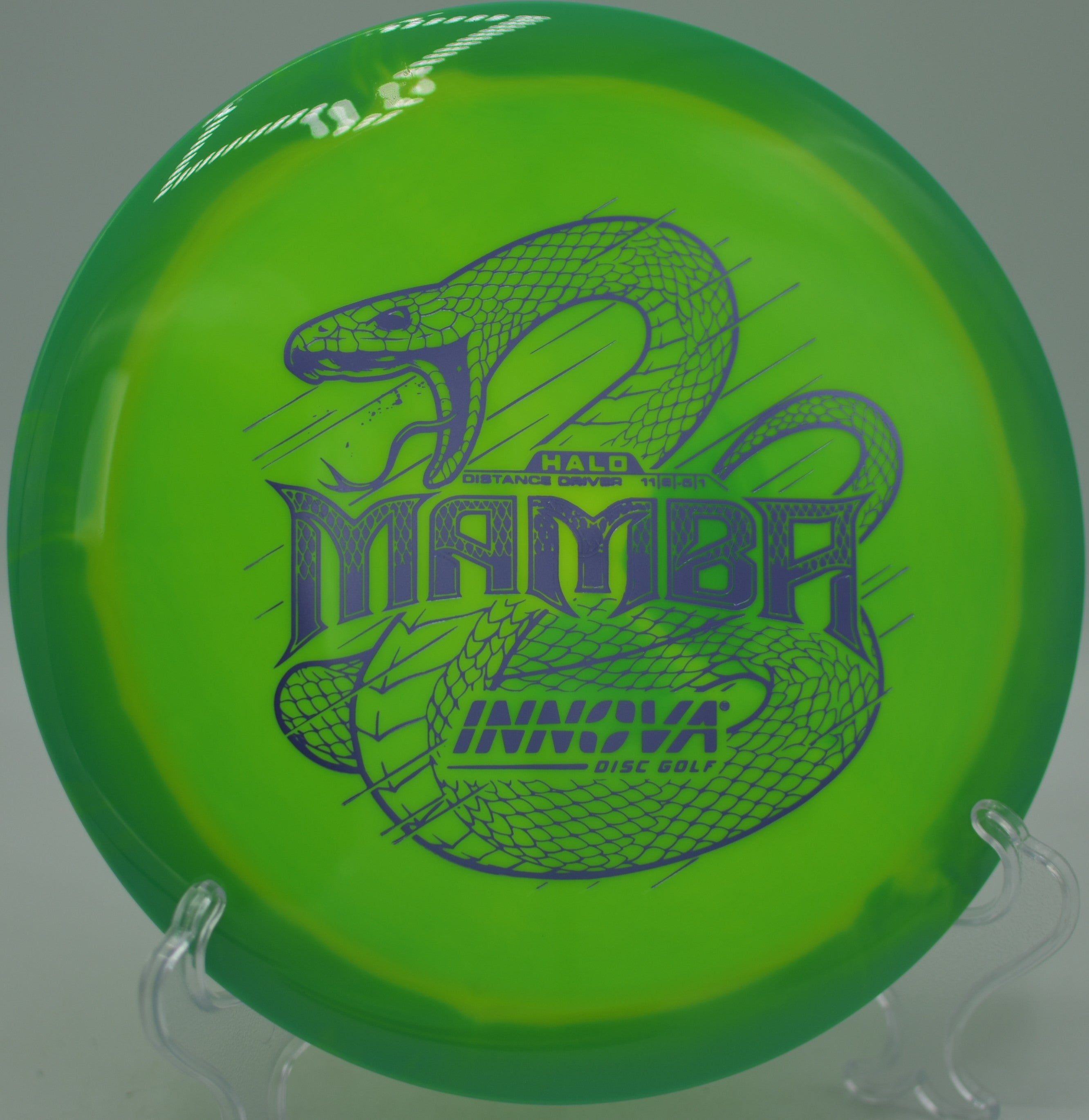 The Innova Halo Star Mamba is an ultra-understable distance driver designed for effortless long flights, massive turnovers, and high-speed rollers. With a significant amount of high-speed turn, this disc is ideal for players with lower arm speed looking to unlock extra distance, as well as advanced players shaping long, controlled anhyzer lines. The premium Halo Star plastic enhances durability while maintaining a comfortable grip, allowing for maximum glide and predictable flight characteristics.