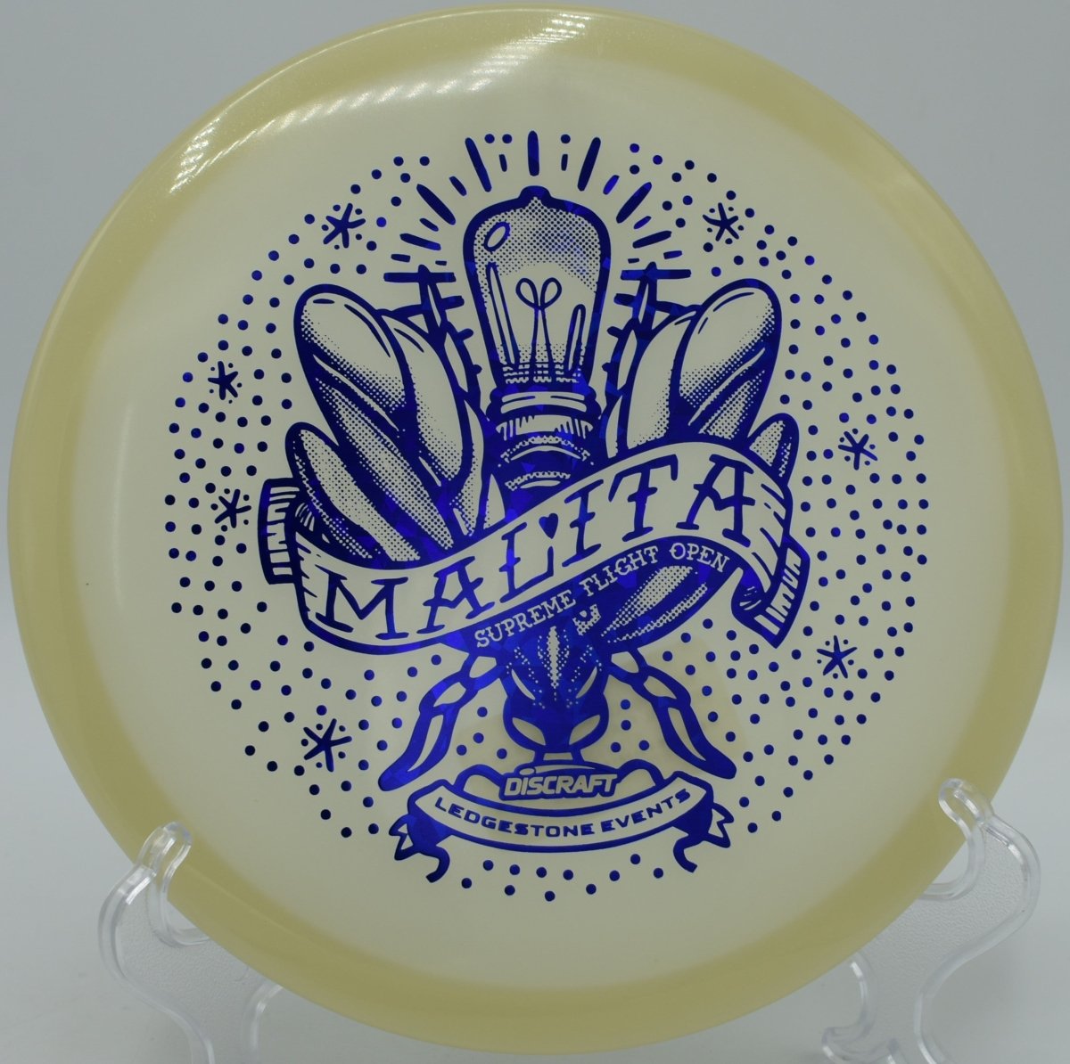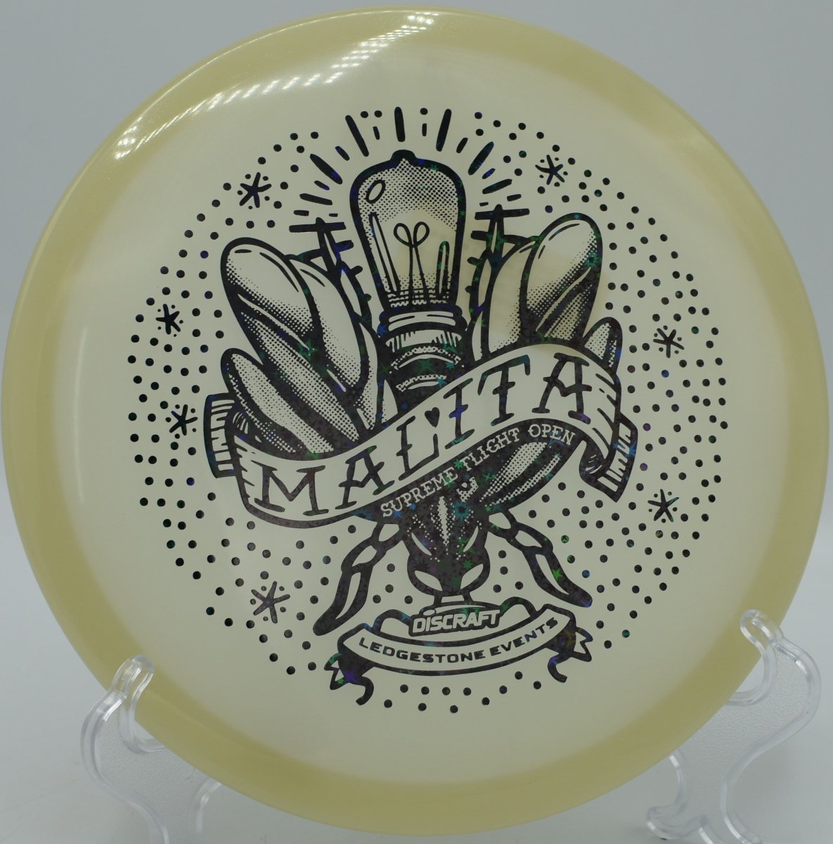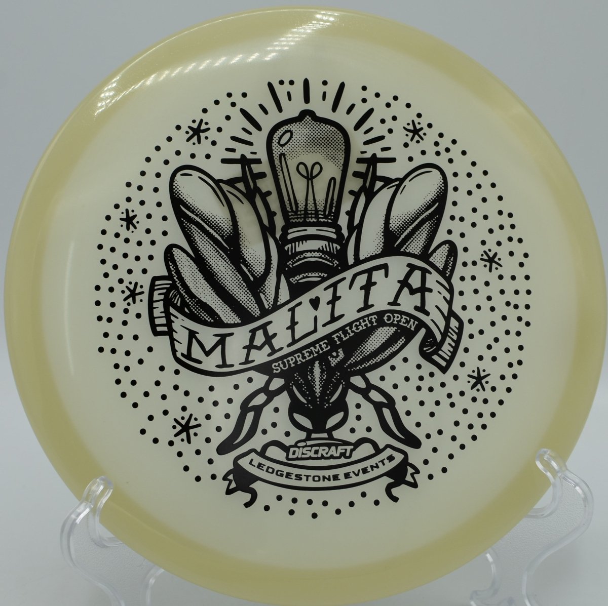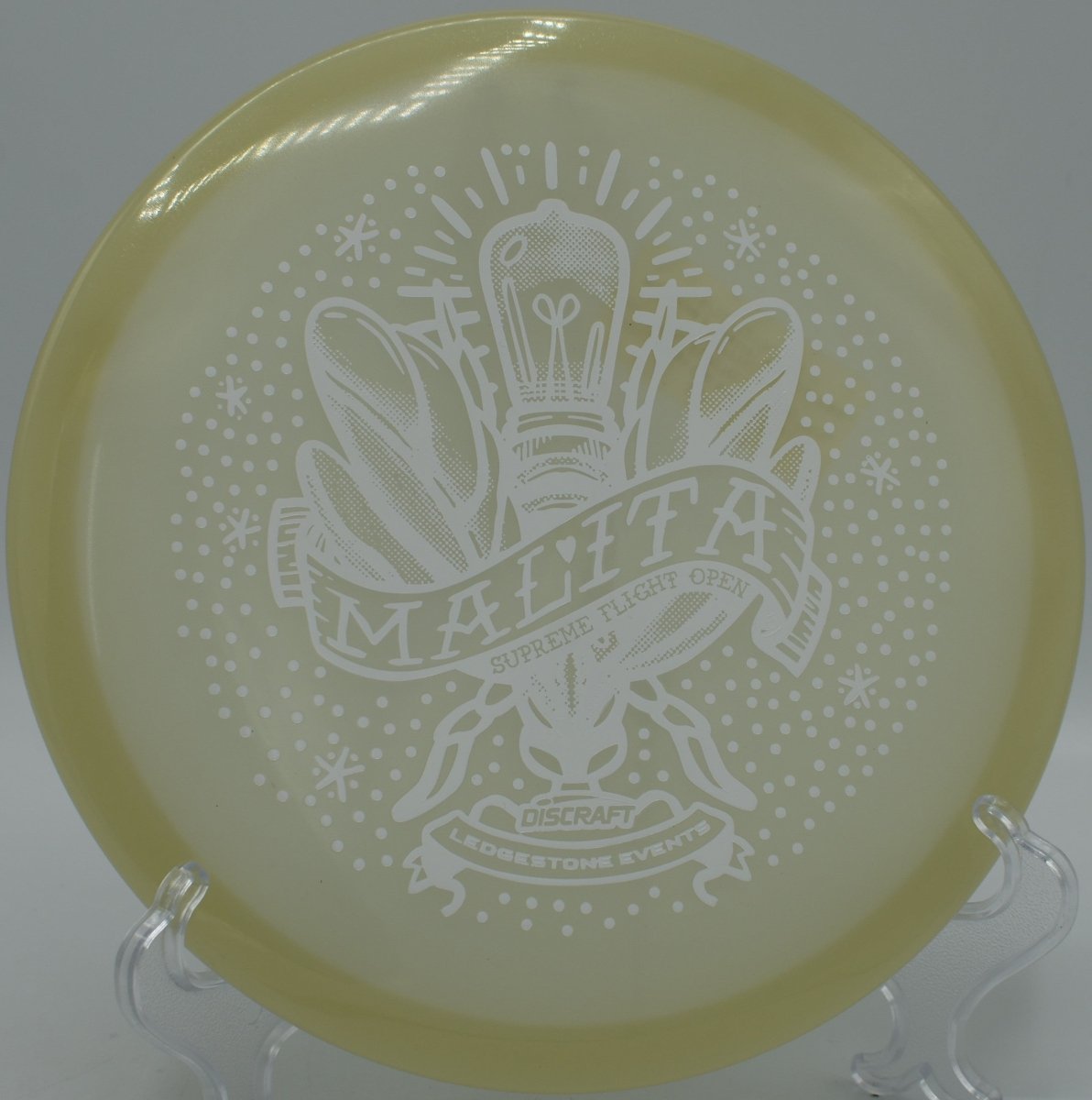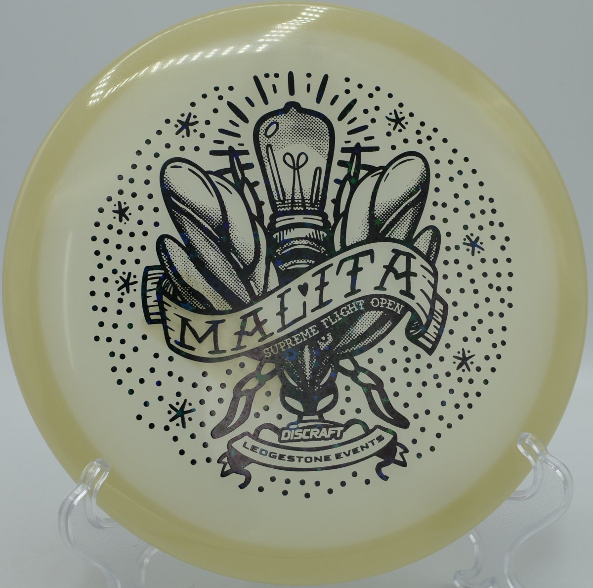 Molded in SFO Mega Glo plastic, this Malita offers a durable, grippy feel with enhanced glow performance for night rounds. The Mega Glo blend maintains consistent stability over time while providing a clean release and dependable hand feel, making it equally suited for daytime precision and glow golf accuracy.