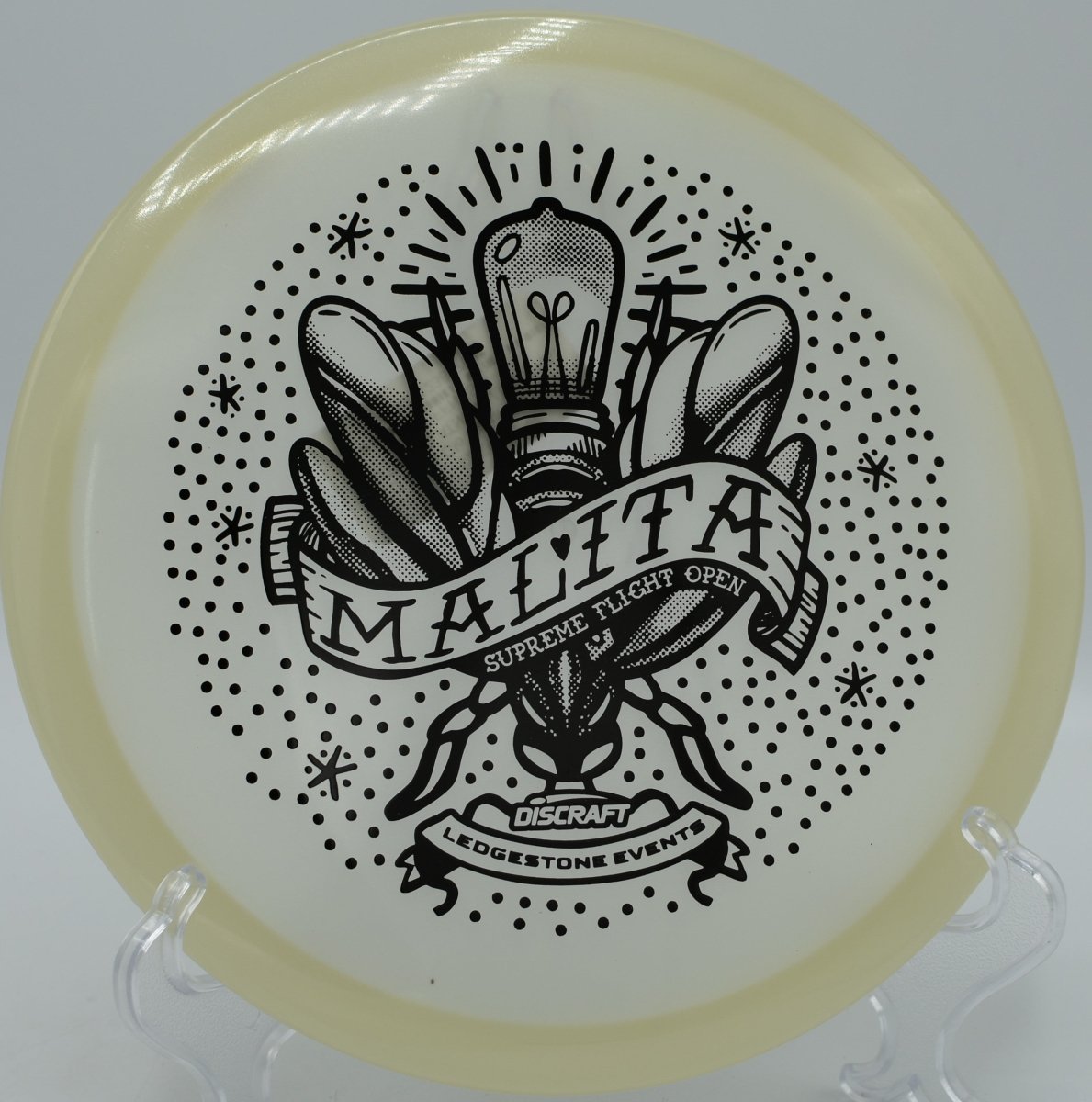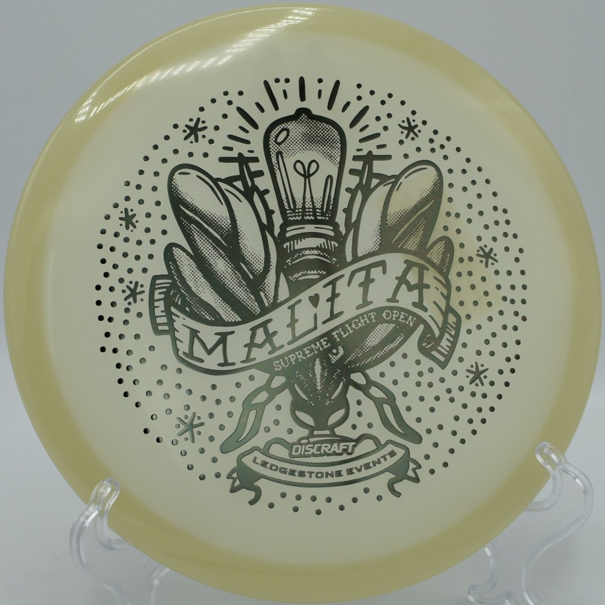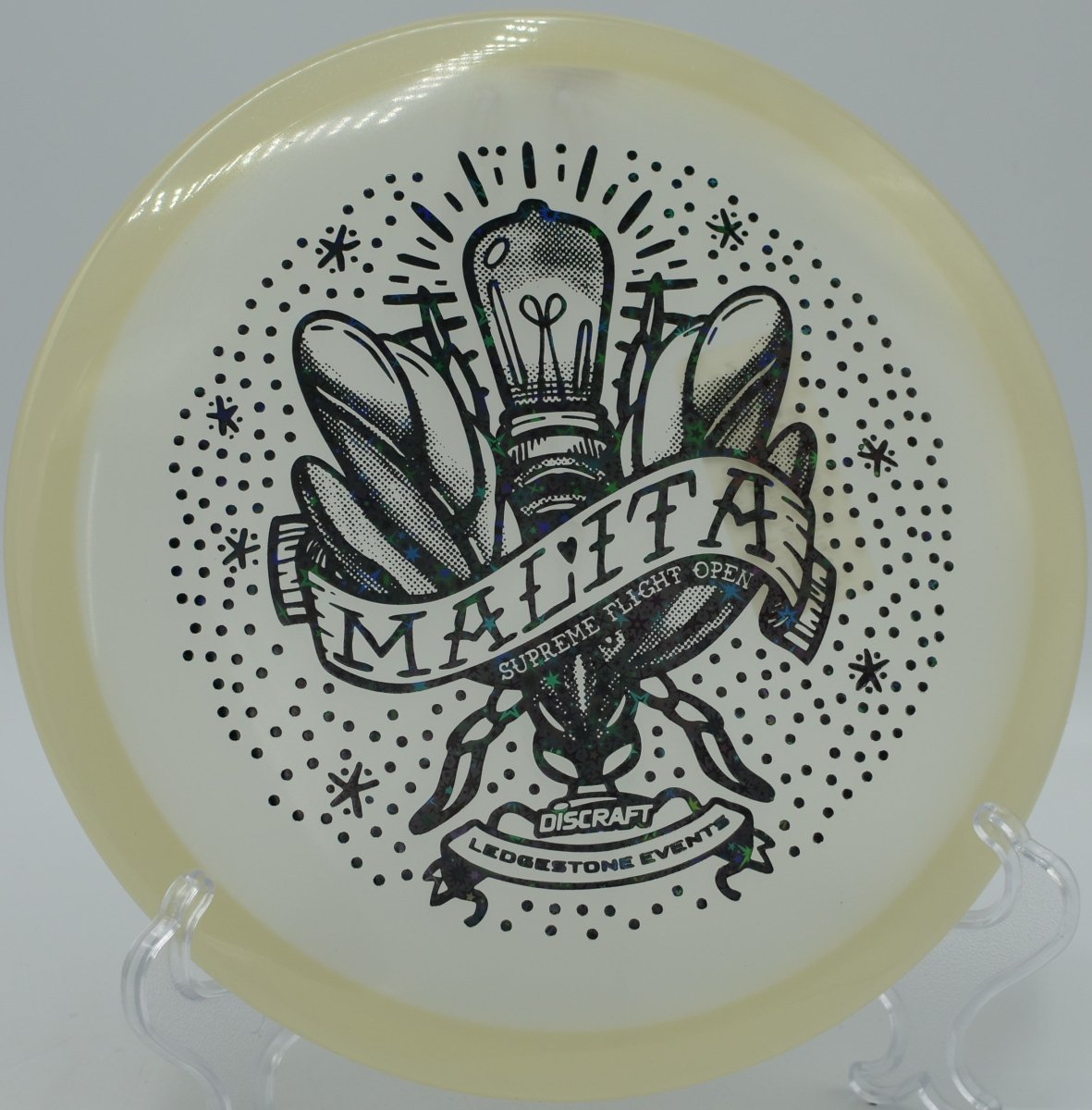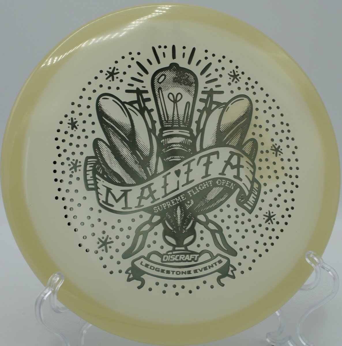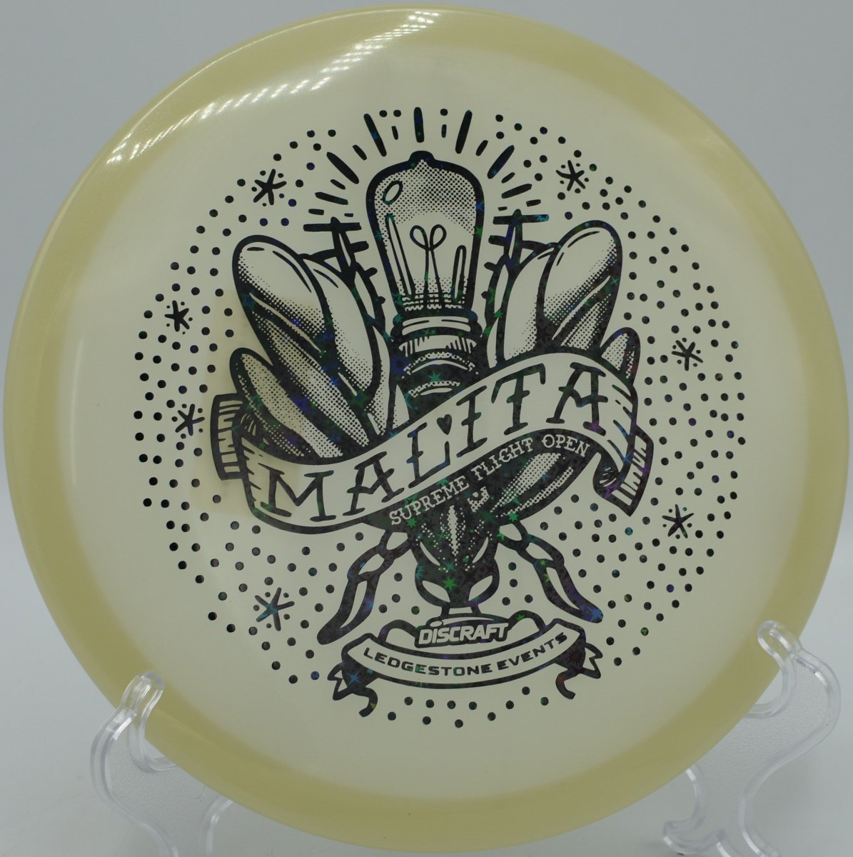 Molded in SFO Mega Glo plastic, this Malita offers a durable, grippy feel with enhanced glow performance for night rounds. The Mega Glo blend maintains consistent stability over time while providing a clean release and dependable hand feel, making it equally suited for daytime precision and glow golf accuracy.
