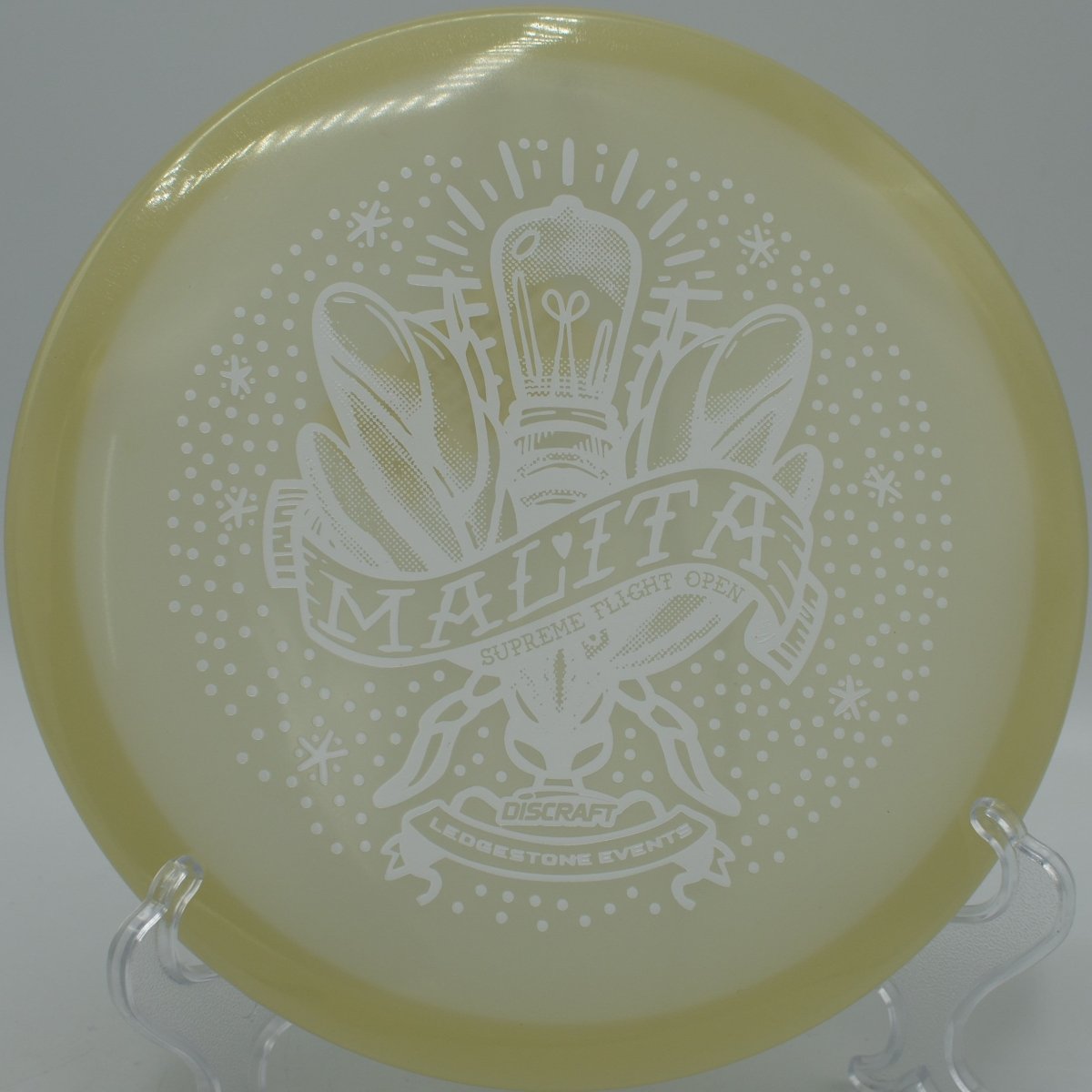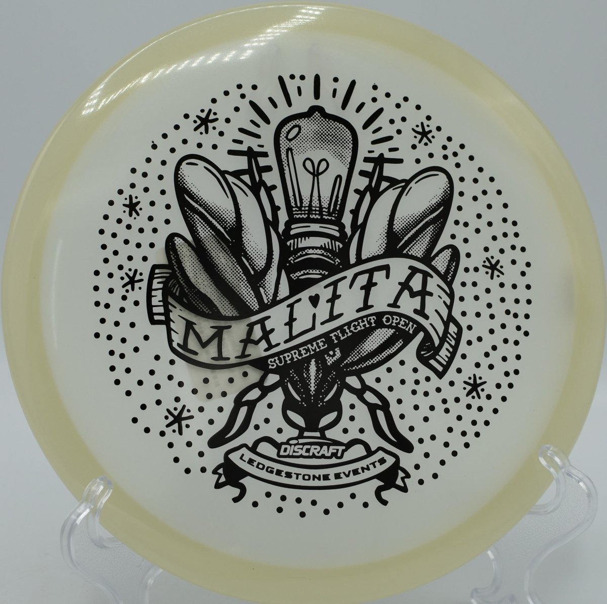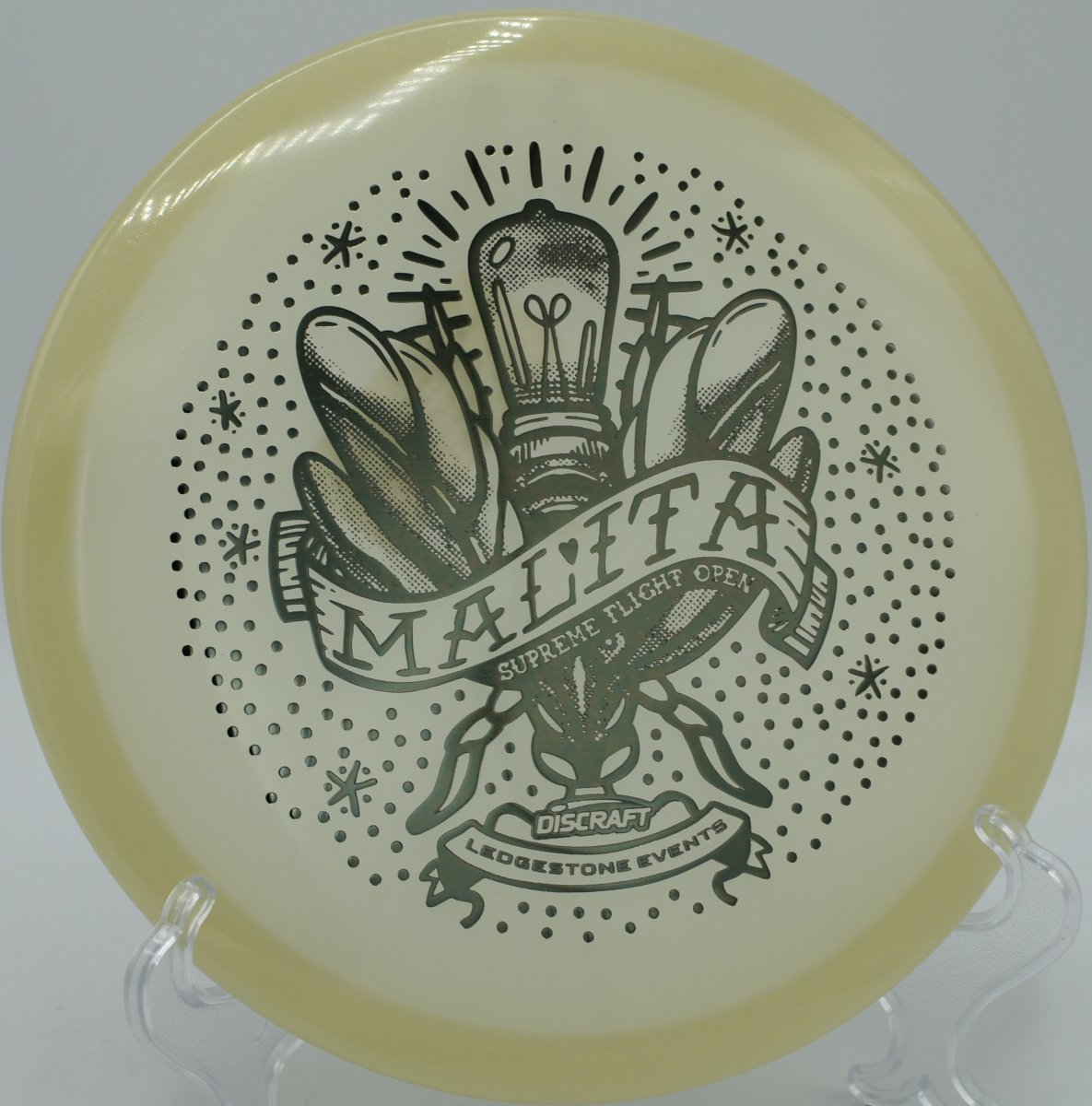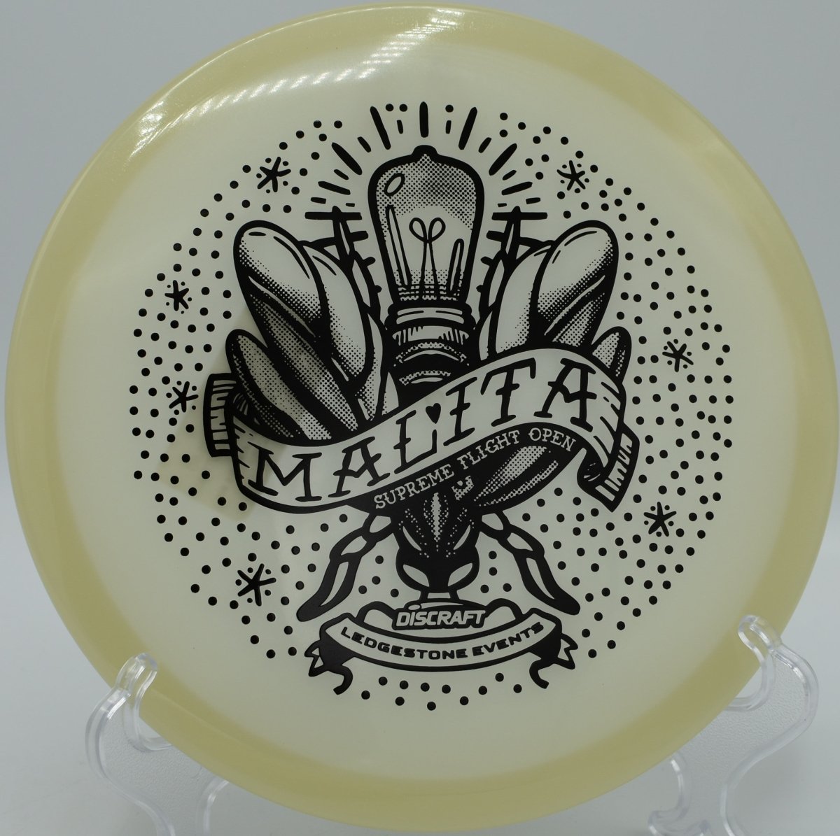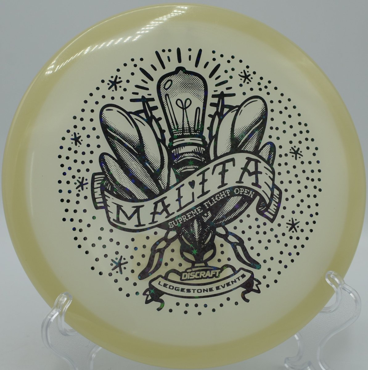 Molded in SFO Mega Glo plastic, this Malita offers a durable, grippy feel with enhanced glow performance for night rounds. The Mega Glo blend maintains consistent stability over time while providing a clean release and dependable hand feel, making it equally suited for daytime precision and glow golf accuracy.