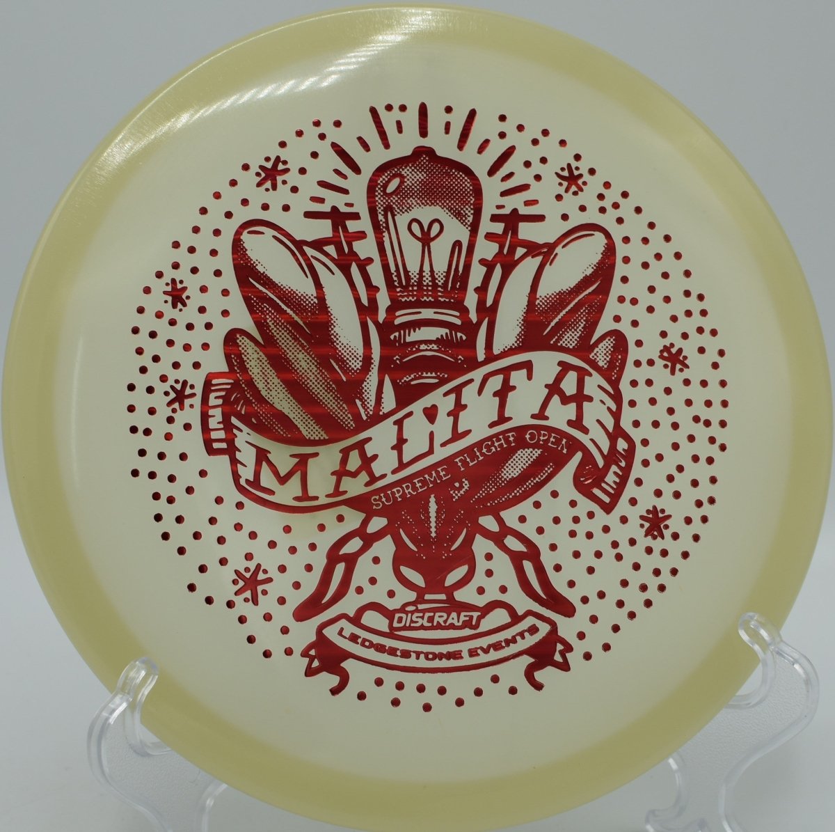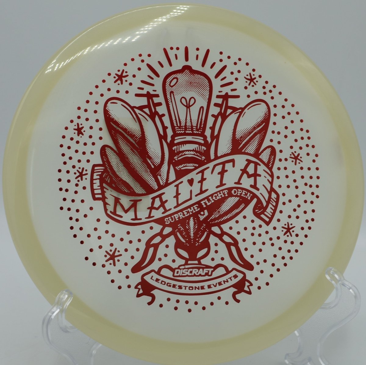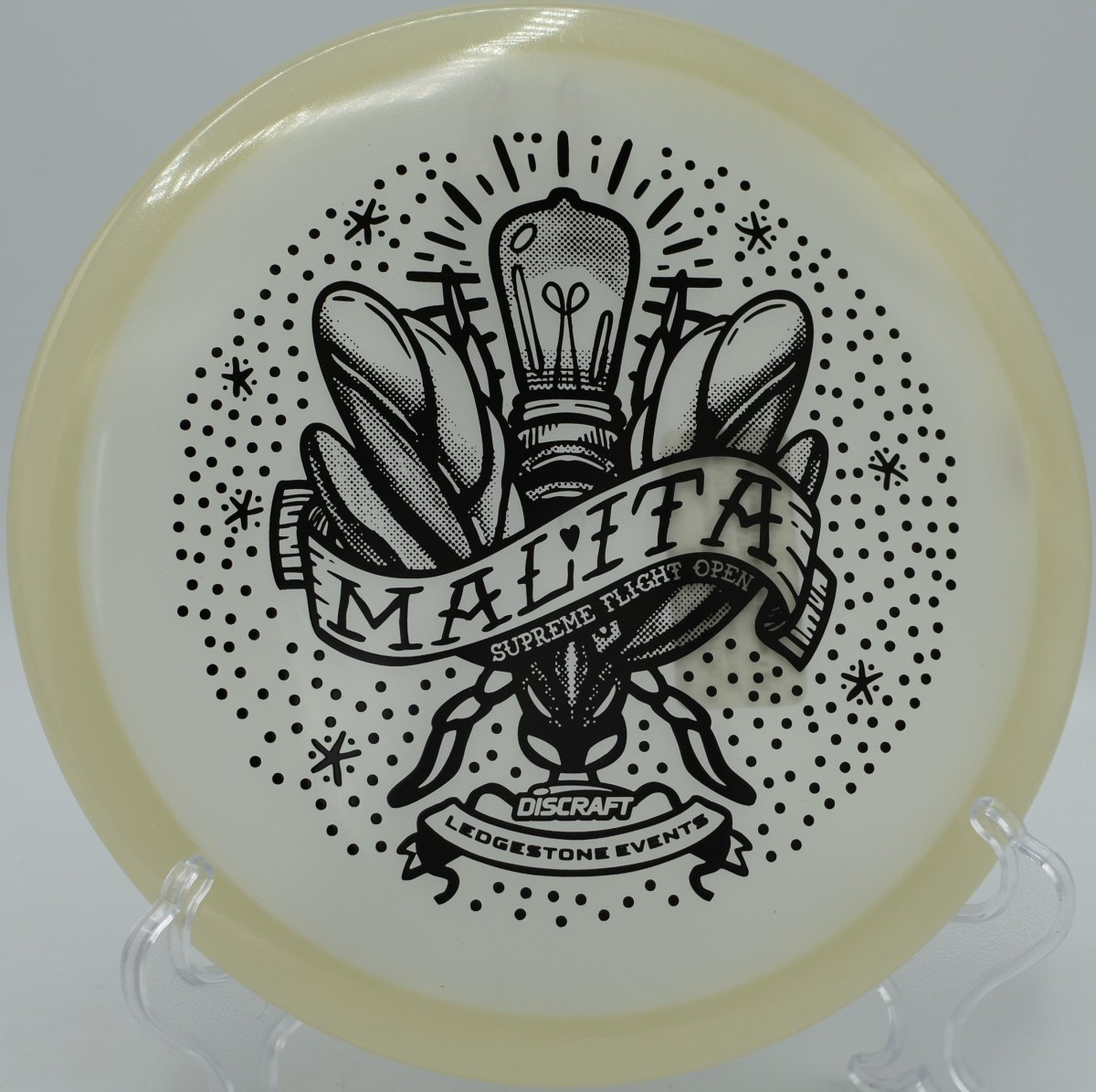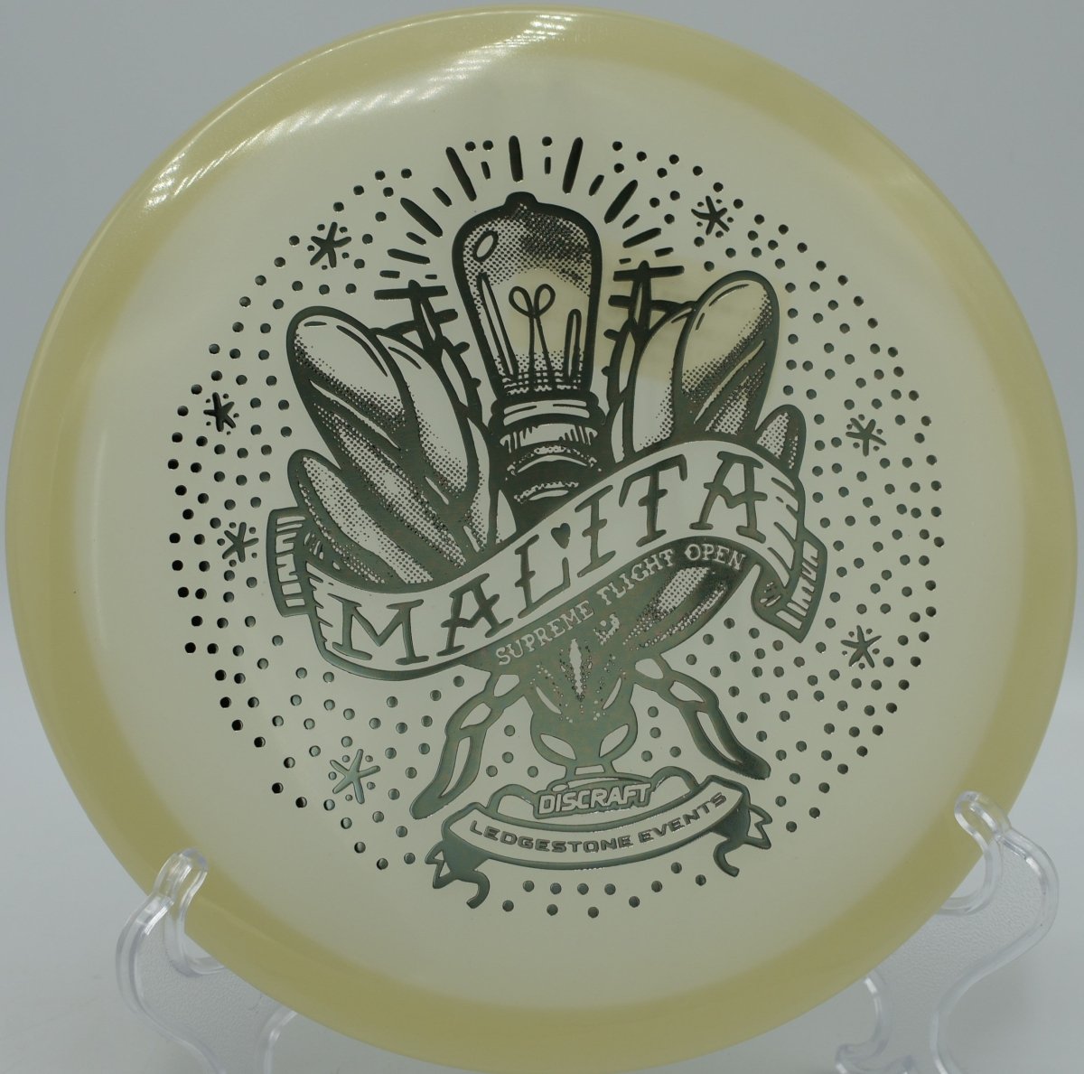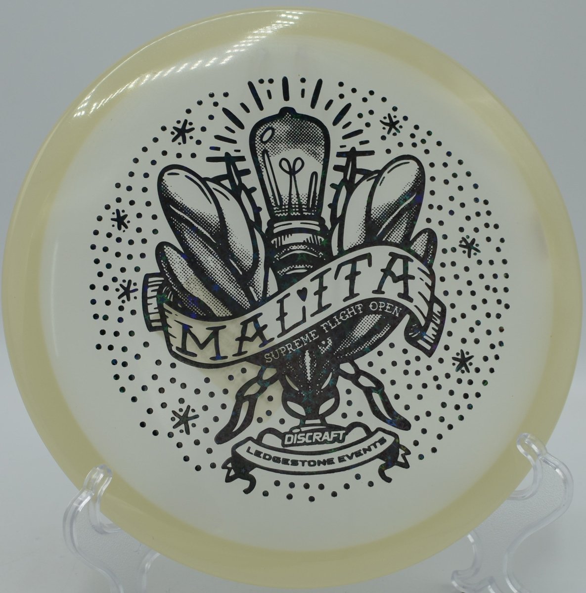 Molded in SFO Mega Glo plastic, this Malita offers a durable, grippy feel with enhanced glow performance for night rounds. The Mega Glo blend maintains consistent stability over time while providing a clean release and dependable hand feel, making it equally suited for daytime precision and glow golf accuracy.